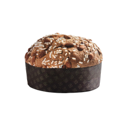Panettone con uvetta ricoperto di glassa e mandorle, incartato a mano.