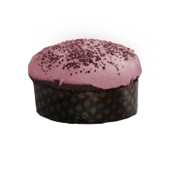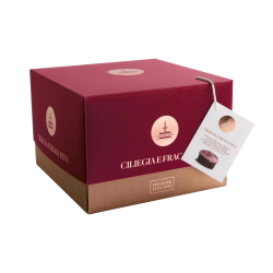 Panettone all’essenza di menta e fragoline semi-candite, ricoperto con confettura di ciliegie di Sicilia e cioccolato, confezionato a mano.